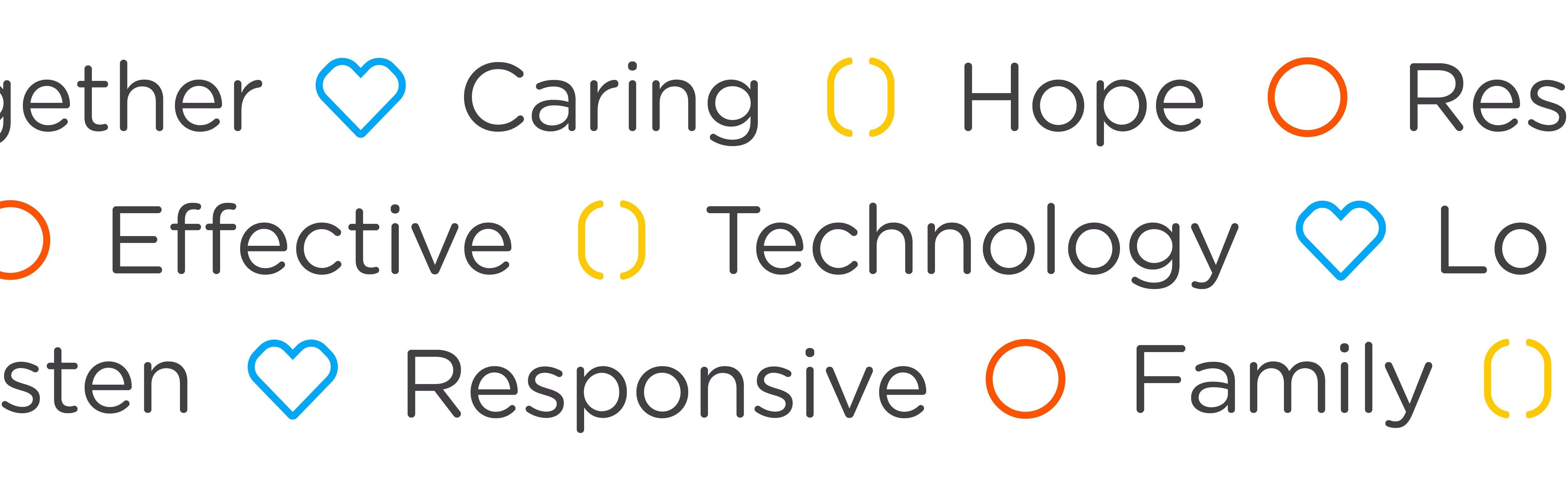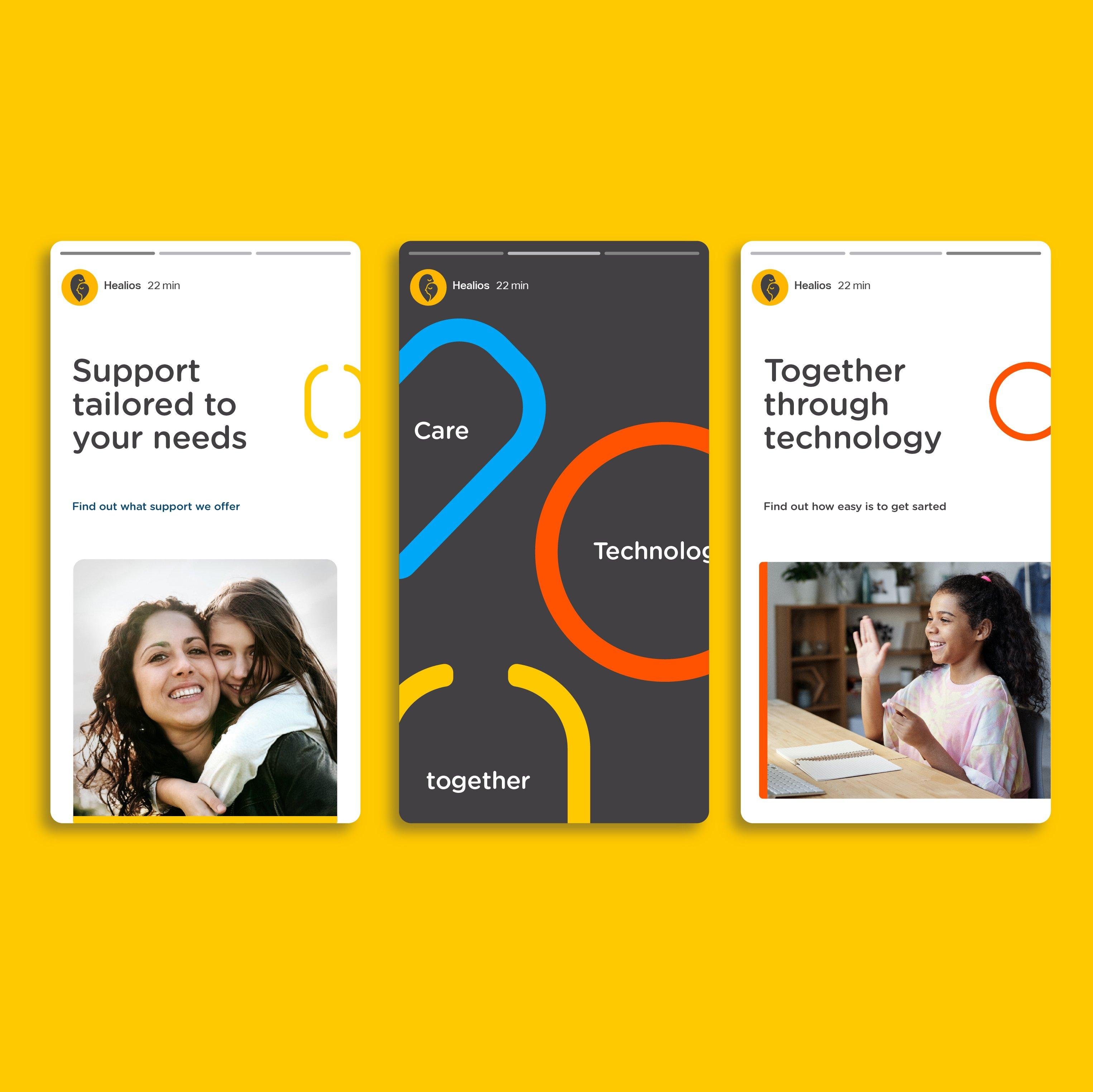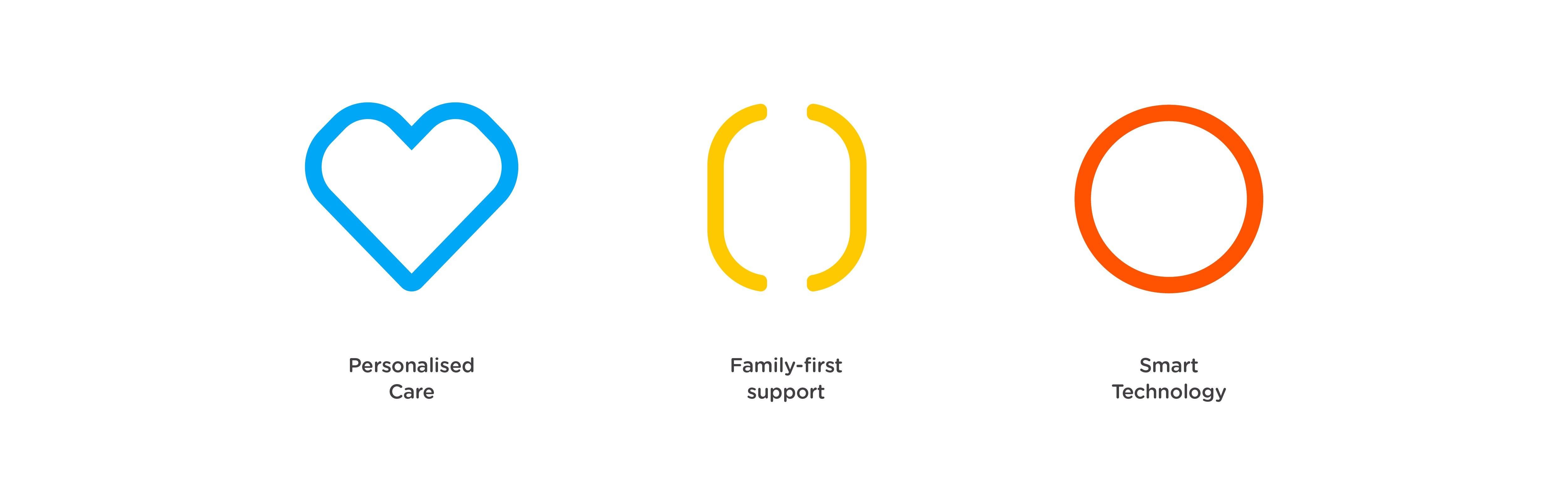 Truly reinforcing the core idea of ‘together’, the Healios purpose had to work across three different stakeholders - Patients, Families and the NHS. To make this work, we broke down their core purpose into three clear values: Family-first support, Personalised Care and Smart Technology. These values encompassed the core beliefs of Healios. Crossing stakeholders, they acted as pillars that inspired the new visual identity.