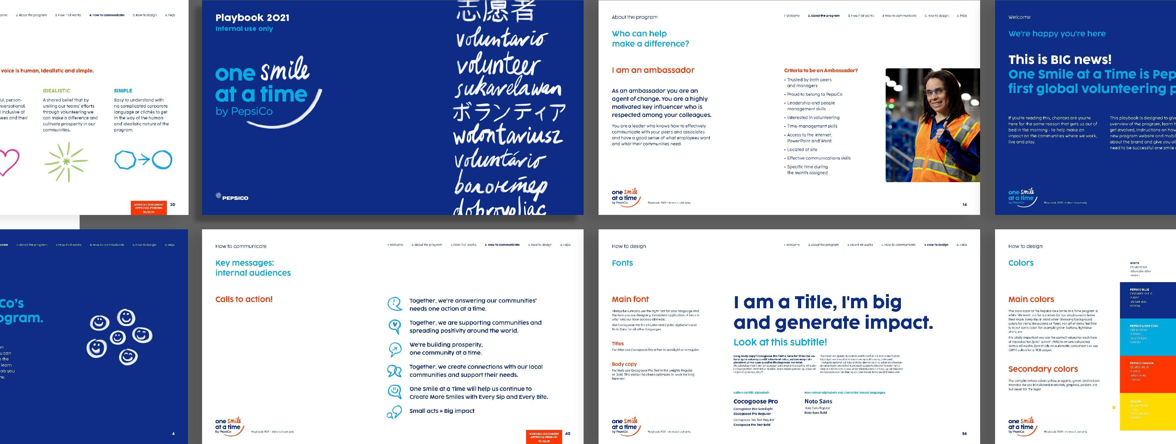 Working with the client, we developed the interactive One Smile at a Time playbook to support ambassadors and market coaches. The playbook gives them everything they need to inspire colleagues to volunteer and lead successful volunteering campaigns. From posters, invitations and t-shirt designs to email and poster templates.