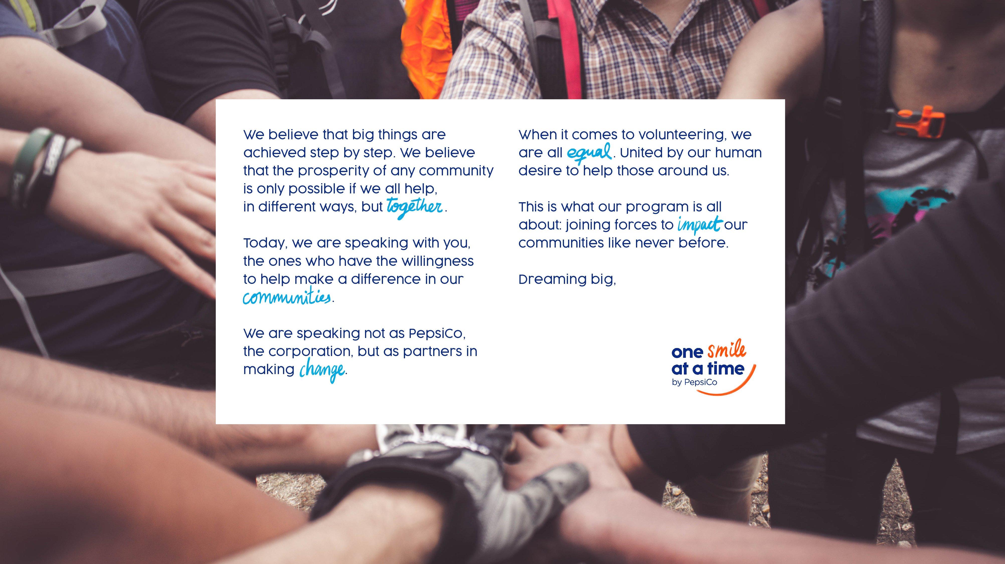 One Smile at a Time creates a sense of belonging, breaks down barriers and considers the impact of not only the individual giving their time, but the impact of the people in their communities. It also empowers PepsiCo employees to choose how they want to participate, and identifies volunteering opportunities in their communities that connect with their personal values and beliefs.